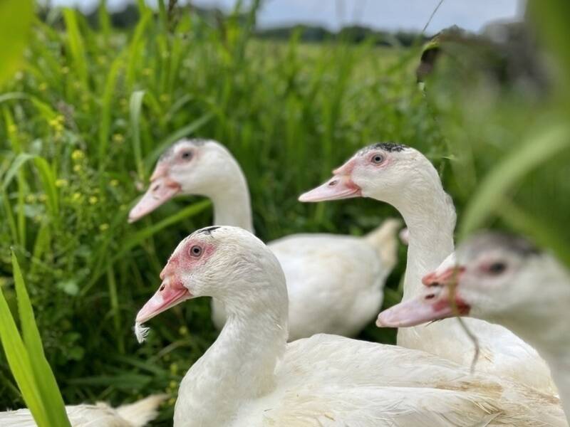 Die Enten (Flugenten) wachsen von Frühjahr bis Herbst bei uns auf dem Hof im Freiland auf und werden mit hofeigenem, gentechnikfreien Futter gefüttert!